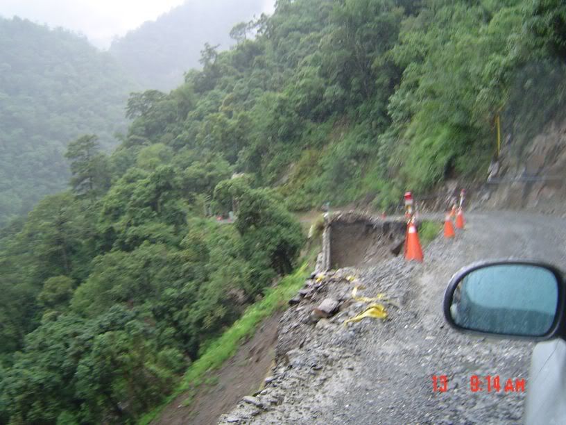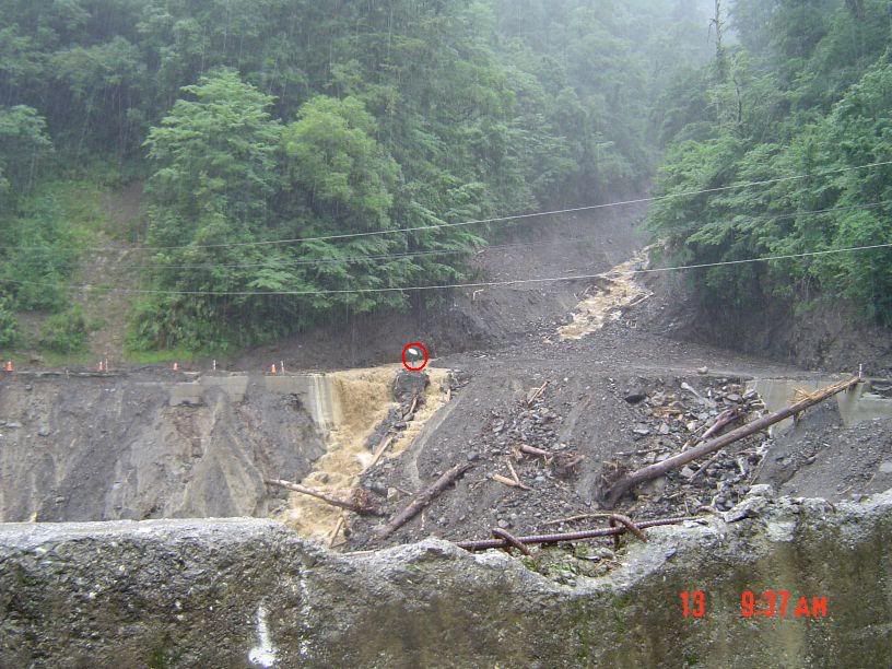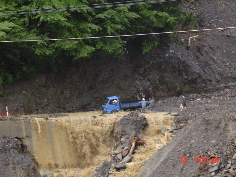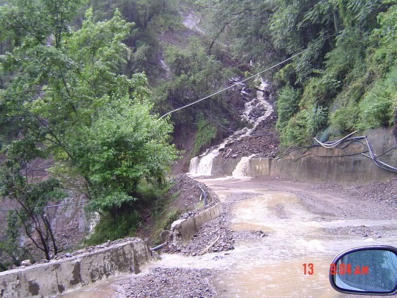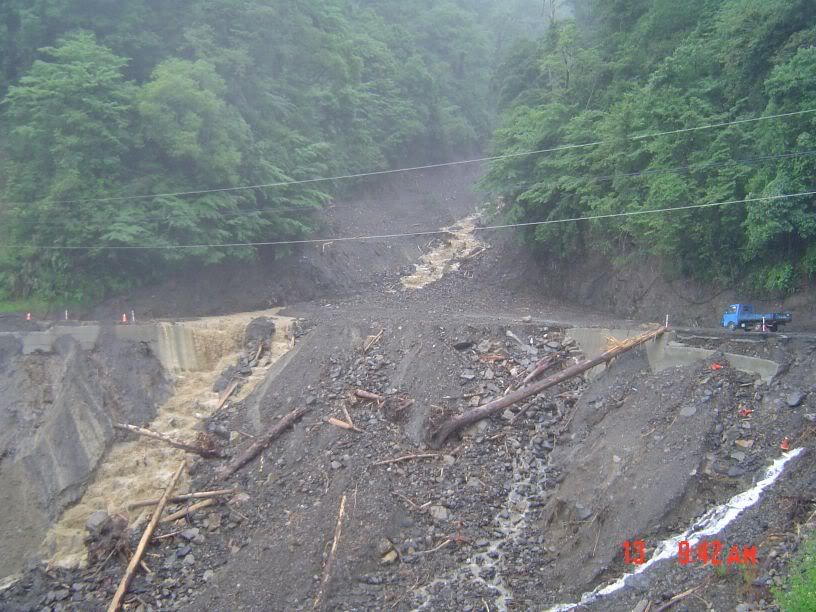 沒關係...昨天上得來今天也下得去... :p ![]() 沒隔多久又一處嚴重的坍方。從921之後就沒來過中橫了,看來真的是不宜久留啊~~ ![]() 走著走著...出現了今天最可怕的畫面... @@ 大面積的土石流.... 直接橫斷路面!! 二方來車都停在兩側觀望,沒有人要先走,因為不知道過不過得去 XD 圓圈中是開貨車的北北,凍未條了跑過去看水的情形....真有點替他捏把冷汗.. ![]() |