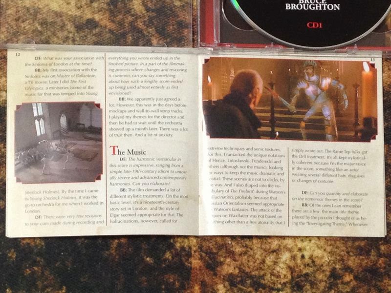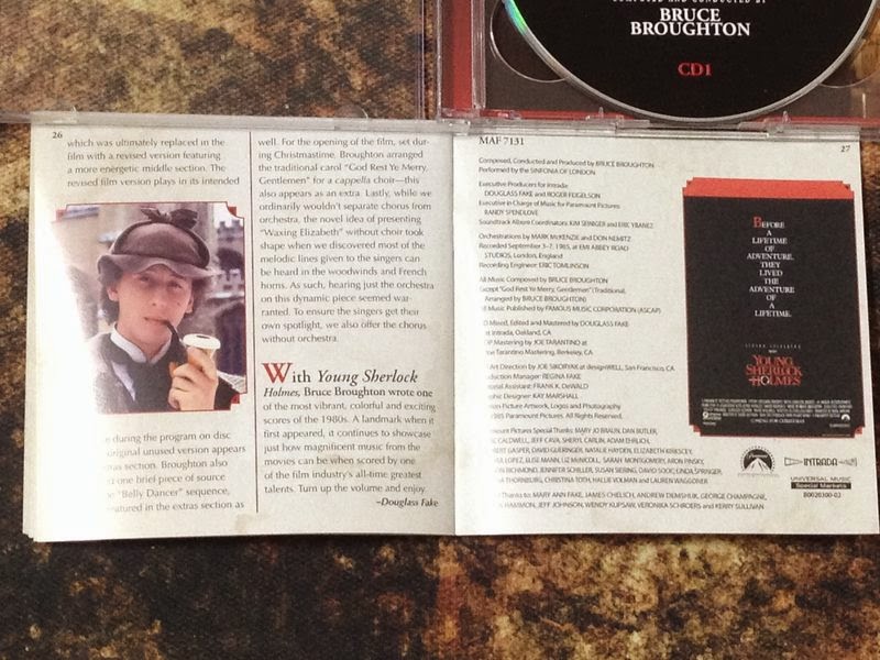 Young Sherlock Holmes Complete Edition(2CD, Bruce Broughton) ![]() 這部配樂真的是等了很多年啊∼ 當年看到這片算是相當意外,而且意外地是聽過這片的人也不多。 本片的故事是原創的,但原創的很有意思,把福爾摩斯故事中的角色來歷給了一個有意思的原創版本。 而且我很喜歡本片這種老式冒險電影的感覺,一切都是八零年代那個想像力的時代。 青少年時期的福爾摩斯與華生的相遇,還解釋了那個大煙斗是怎麼來的。 右下角那位是福爾摩斯的初戀(應該沒記錯?),這應該不算爆雷吧∼ 在哈利波特中也能看到的超級長桌。 右邊這個CG角色據說是ILM最早創造出來的CG成品之一。 開幕的一場戲轟動了全校,介紹出了一個百年不衰的偵探。 左邊那張雪地中的街景,我很喜歡這種風景。 好熟悉的一幕,不是嗎?在魔宮傳奇中,印第安那瓊斯一行人也曾以類似的方式偷窺邪教儀式過。 既然是英國的偵探冒險故事,怎麼可以沒有倫敦塔上的大笨鐘出場呢? 令人心碎的一幕,促成了福爾摩斯終生未婚,且塑造出了他日後孤傲的形象。 期待在藍光時代能收到這片。 這部配樂的完整版發行計畫從去年就耳聞,一直等到今年才終於看到Intrada正式要在4.1發行,差點還誤以為是愚人節笑話。 我一直很喜歡這種類型的配樂,古典傳統又略帶趣味的動作冒險管弦,就像是印第安那瓊斯一樣。不一樣的是,這部的主人公是偵探,加上又是青少年,音樂比起印第安那瓊斯有著更年輕活潑且又文雅一點的英式氣質。 |