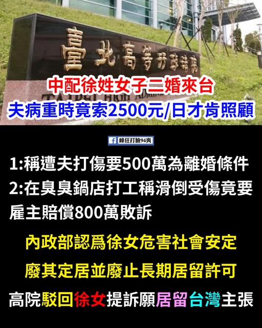 北北基桃 難民朋友假結婚二婚的中共配被撤銷居留權了 張哥:我台灣假結婚的難民朋友假結婚的二婚破麻完犢子了 徐姓陸籍女子二婚蕭姓男子赴台,因價值觀差異屢齟齬,多次離家,蕭重病時,夫兄日付2500元(台幣,下同,約80美元),她才願照顧。徐女稱工作時「跌傷」,向雇主索賠800萬元(約25.8萬美元),還向移民署表示取得身分證就申請低收入戶補助、身障福利。蕭病歿,內政部認為徐女有危害社會安定之虞,不許定居並廢止長期居留許可,她提行政訴訟吞敗。 徐女在中國大陸有兩名女兒,她再嫁蕭姓男子,內政部允許在台長期居留。徐女2022年2月15日申請在台定居,但蕭翌月即死亡。 移民署2023年1月底開定居審查會,因徐女的依親對象已死亡,她在台的家庭支持系統薄弱,大陸則有女兒和雙親可依,考量國家整體利益以及社會安定性,依兩岸人民關係條例等規定,決議不許可她申請定居,並廢止長期居留許可及註銷長期居留證。 依規定,徐女收到處分書翌日起10日內須辦出境證,於出境證所載10日期限屆滿前離境。徐女提訴願遭行政院駁回,改提行政訴訟,請求撤銷原處分及訴願決定,要求內政部准許定居。她主張,內政部以她狀告前雇主、求償800萬元,如取得身分證將濫用司法資源,到處興訟,是「臆測之詞」,認為提告是憲法保護的權利。 內政部依移民署苗栗縣專勤隊的訪查,指徐女2016年因與夫家親友不睦,反覆離家再返家,且以遭丈夫打傷為由,要丈夫給500萬元(約16萬美元)當離婚條件;社工曾協助安置,但庇護期間卻不配合安置機構規定,她只要覺得不滿,便撥打家暴專線或報警。 徐女曾在台中后里一家臭臭鍋店工作,她聲稱「滑倒受傷」,要雇主賠償800萬元但敗訴;丈夫生病住院,夫兄每日須付2500元,徐女才願照料。 台北高等行政法院指出,陸配定居可申領身分證,為維持國家安全、社會安定及保障人民權益,應採取較嚴格的審查。審理發現,徐女和前夫生有兩女,她在台多從事臨時工,但都維持不久。北高行認為蕭已經死亡,徐女情緒控制欠佳,且計畫取得國民身分證後,申請低收入補助及身心障礙證明等社會福利,恐造成社會負擔,內政部的處分應予尊重。 最高行政法院認同北高行見解,駁回徐女上訴確定。 https://news.tvbs.com.tw/local/3039849 陸配二婚來台謀劃申請低收入補助 居留遭廢止興訟敗訴確定 記者 潘千詩 報導 發佈時間:2025/11/09 14:44 最後更新時間:2025/11/09 15:01 https://www.worldjournal.com/wj/sto...wj_maintab_cate 照顧丈夫要收費、濫訴雇主…陸配遭認危害安定 夫歿不准留台 記者王宏舜/台北9日電 2025-11-09 01:24 ET https://udn.com/news/story/7321/9126918 陸配遭認「危害安定」 夫歿不准留台 2025-11-09 00:00 聯合報/ 記者 王宏舜/台北報導 ![]() ![]() ![]() |