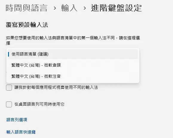 慣用語言,新增語言 選一個英文套件(新增鍵盤輸入) 繁體中文放上,英文放下 在你上圖的位置,選擇剛剛新增的英數 |