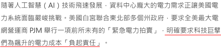 甚至已經停廠的,G 等都花錢讓停用的維修後重啟。因為這樣比較快。 電力設備廠 產能開不出。給錢也沒用。 晶圓廠、資料中心 全是吃電怪獸。 更不要說 資料來不及餵(爬蟲),放著就一直耗電。 散熱也吃電,運算也吃電。 現在下單不要說擴廠了,電力設備製造商 產能根本沒辦法。 排隊?慢慢排吧。 台灣不管是軟體、硬體都沒機會了。 唯一沾到邊的已經半美的 美積電。 AI數據中心壓垮美國最大電網,13州6700萬人或遭輪流停電 https://www.ptt.cc/bbs/Stock/M.1768387103.A.07F.html |