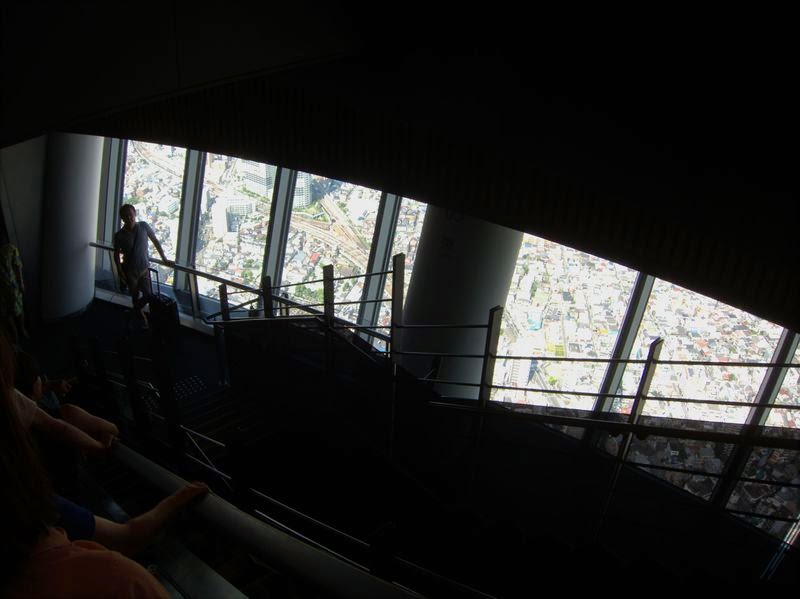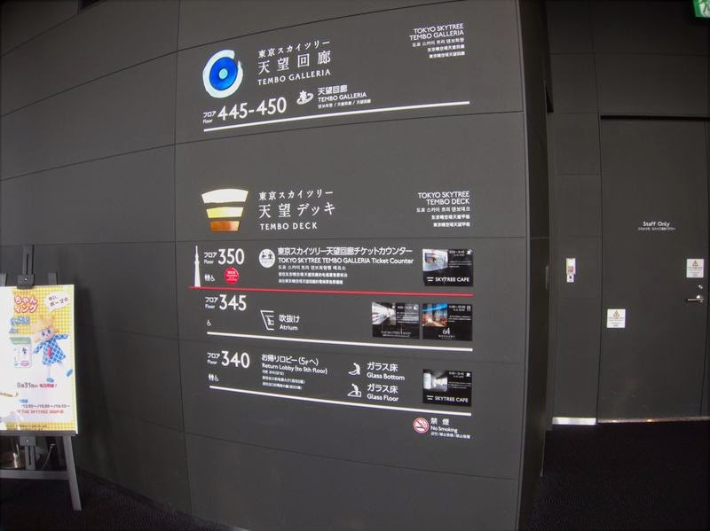 排隊買票要很久,排隊等高速電梯倒是很快,買好票沒多久就等到電梯可以上去了。天空樹的高速電梯不僅快,而且安靜,然後也感覺不到甚麼重力慣性,不管是往上還是往下都一樣,搭乘的感覺很神奇。明明移動速度非常之快,但就好像沒有移動的感覺一樣,加上整個電梯都是封閉的,完全看不到外面的景觀。