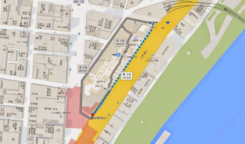 從東武本線出來後發現,東武本線的浅草駅車站大廳並沒有跟銀座線連通,向站務人員詢問一番後才得知,要搭乘銀座線需要出車站後要沿江戶通り往浅草寺方向步行一段距離後才能到達銀座線的車站。