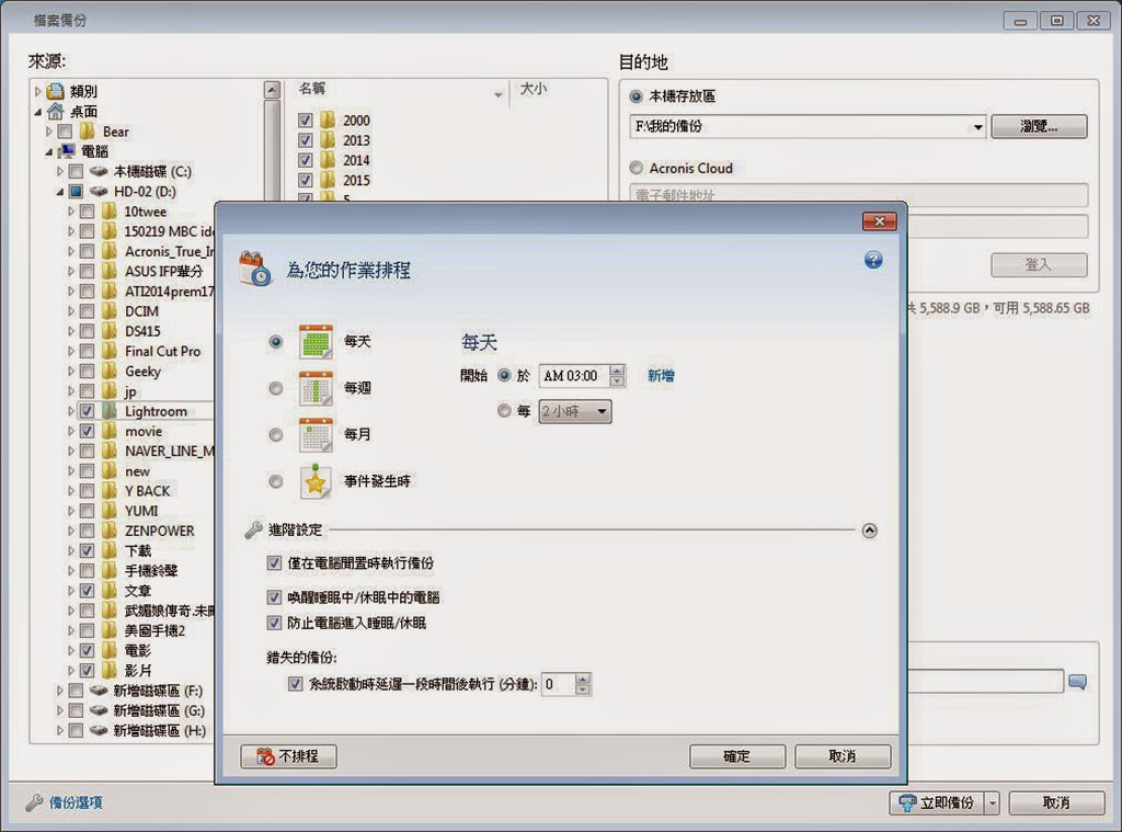 在左下角有一個時間排程的設定,點選之後就可以自己選擇你要自動備份的時間。因為照片每天都有機會會新增,所以我選擇了每天備份。備份時間就設定在半夜的時間,通常那段時間也不太會用電腦,所以拿來備份剛剛好。