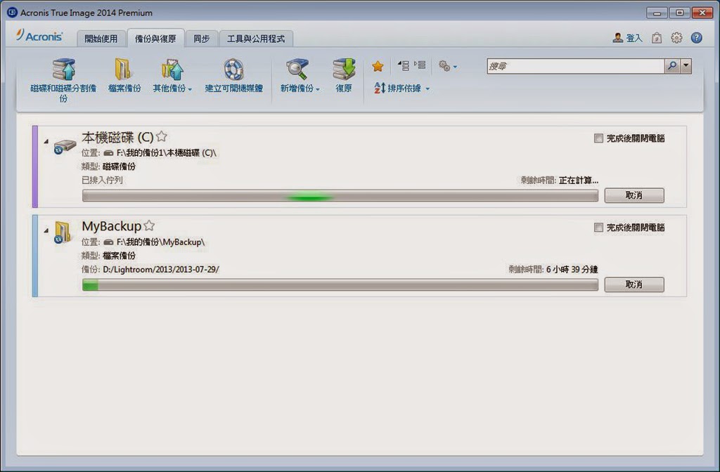 設定完成之後,點下立即備份。就會開始第一次的備份動作,因為檔案蠻大的,相對的備份時間也會比較久一些。不過 Acronis True Image 的檔案備份真的非常簡單,看過一次應該就會明白該如何設定自己需求的備份方式。