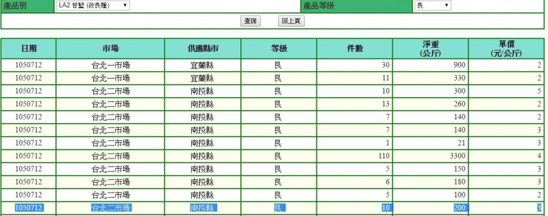 比對7月12日交易的等級、數量、件數、單價等,可以發現這個農民賣的是改良種。(圖:截自台北一市網頁)