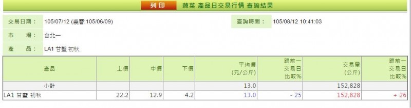 7月12日台北一的高麗菜初秋品種交易價,上價22.2元,下價4.2元。(截自台北一市網頁)