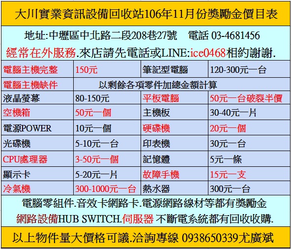 台北來來電腦回收到府回收廢電腦主機. 筆電.螢幕.伺服器.網路設備! 歡迎加LINE:ice0468 或電0938650339 相約 |