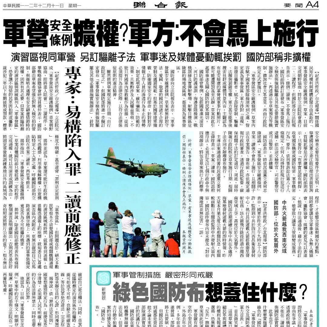 立法院即將三讀軍事營區安全維護條例草案。此法嚴禁對軍事重地擅自攝影,也授權軍事重地可擊落有害無人機。