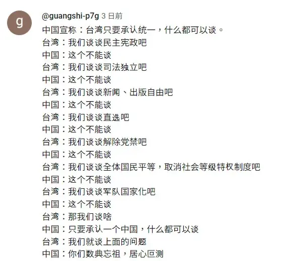 還吹啥 92 https://yt3.ggpht.com/3mTgWdSp_UxPe...A=s558-rw-nd-v1 各自走各自的道路才是真的 大家說好不好 :這樣吧,口國真就只有兩個不能談 :真的?哪兩個? :這個不能談,那個也不能談 :………… 你對祖國不滿意嗎? “沒有, 很滿意。” 你對黨和政府不滿意嗎? “也沒有, 很滿意。” 那你為什麼要跑到國外去? “哦, 因為那裡允許我不滿意!” ![]() |