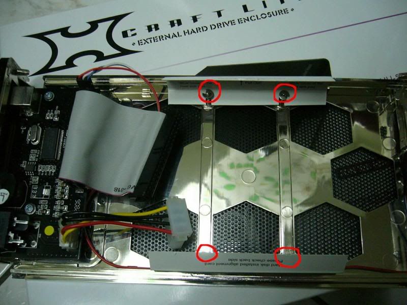 10.內部圖析(四個畫紅點的則是防震的設計有點像汽車避震器那樣有個彈簧可以吸收掉震動>_<四個點則是把硬碟機板那面的四個螺絲給對上就OK了)
