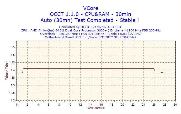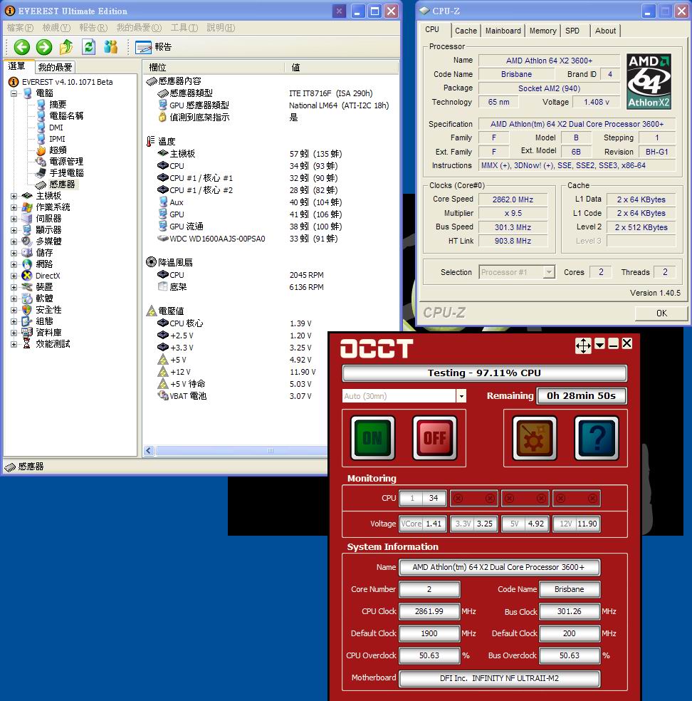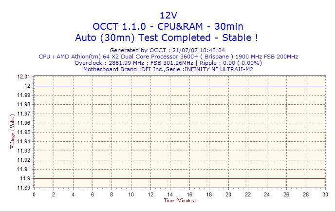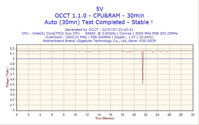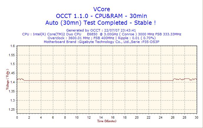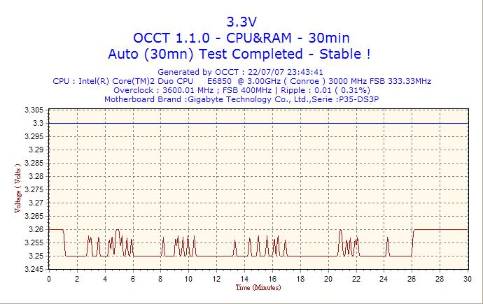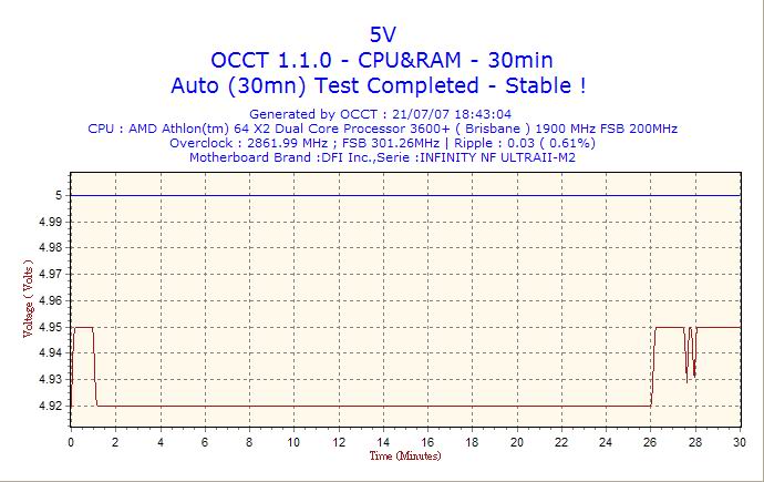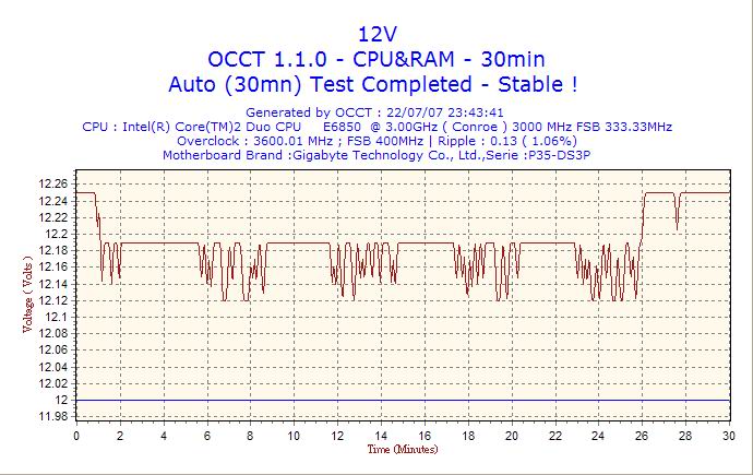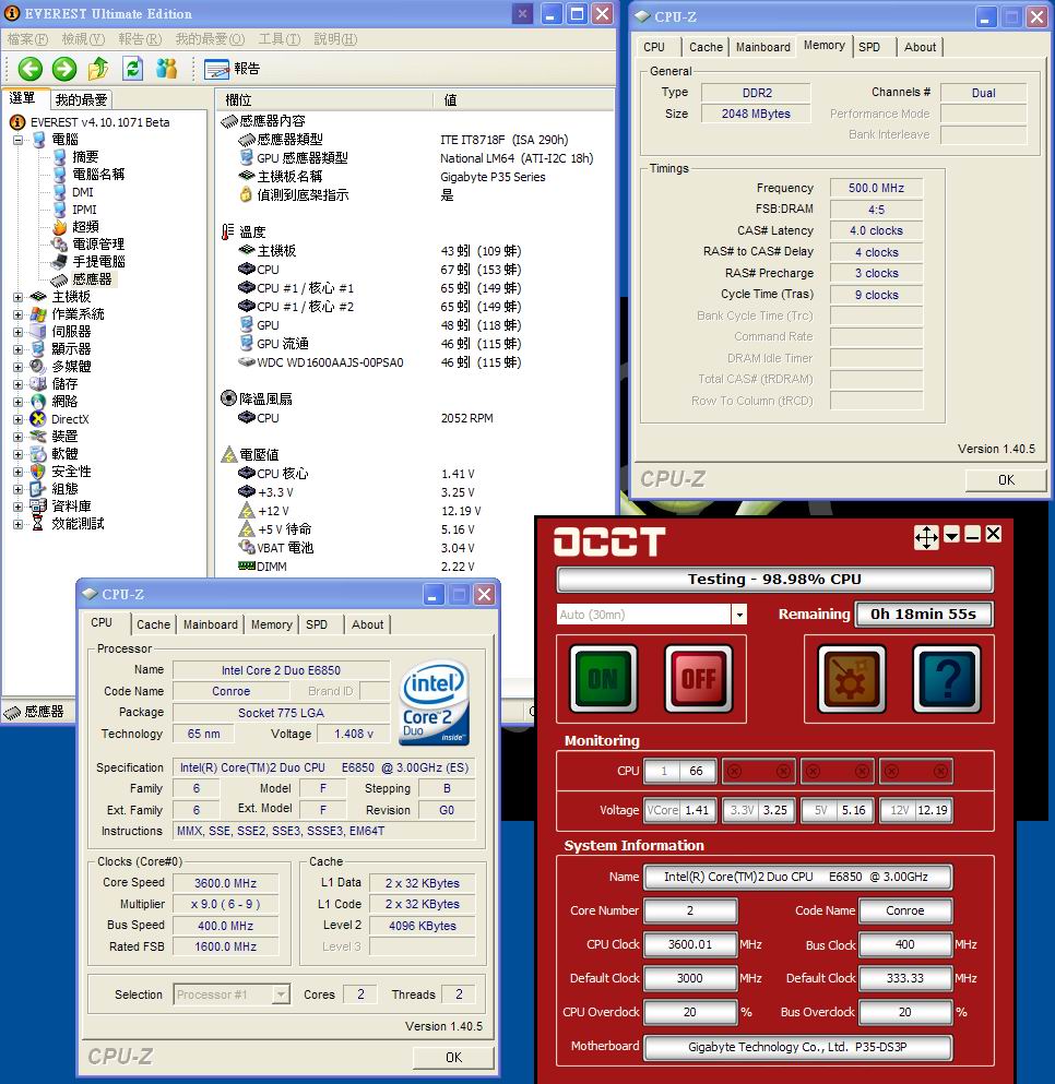 每張主機板測壓都有些微落差,要量出正確電壓要使用電表 使用OCCT軟體測試,只代表實際運作下,觀看電壓起浮變化 AMD測試平台 CPU:AMD AM2 Athlon64 X2 3600+ MB: DFI INFINITY ULTRAII-M2 DRAM:CORSAIR TWIN2X2048-10000C5DF VGA:ATI X1950XTX 512MB HD:WD1600AAJS POWER:Thermaltake Toughpower 850W Cooler:Thermaltake V1 ![]() 主機板在BIOS下測壓狀況 ![]() OCCT ![]() OCCT測試完,相關資料表 CPU溫度 ![]() CPU電壓(與主機板比較有關) ![]() 3.3V:落在3.25~3.26V間 ![]() 5V:落在4.92~4.95V間 ![]() 12V:落在11.9V沒有動靜 ![]() INTEL測試平台 CPU:INTEL Core 2 Duo E6850 MB: GIGABYTE P35-DS3P DRAM:CORSAIR TWIN2X2048-10000C5DF VGA:ATI X1950XTX 512MB HD:WD1600AAJS POWER:Thermaltake Toughpower 850W Cooler:Thermaltake V1 ![]() OCCT ![]() OCCT測試完,相關資料表 CPU溫度 ![]() CPU電壓(與主機板比較有關) ![]() 3.3V:落在3.25~3.26V間 ![]() 5V:落在4.5~5.2V間 ![]() 12V:落在12.12~12.25V間 ![]() Thermaltake Toughpower 850W 優點 1.金屬質感的外殼,不同於其他廠使用黑色亮面的設計 2.主動PFC.四個PCIE電源與四12V輸出最高達到62A 3.14cm散熱風扇,實際使用時風量足夠也兼顧靜音 4.價格比其他廠的800~900W便宜一些 5.測試中大部份狀況電壓都相當穩定,比起其他600~700W版本好上一點 缺點 1.外包裝可以在加上一些,放上更多的產品資料或更詳細的說明書 2.產品為三年保固,建議高階產品600~700W以上的規格,保固可以延長到五年會更好 模組化的線才也可以依使用者需求安裝,線材長度剛好,沒有過長或太短的問題 14cm的散熱風扇也讓PSU本體的溫度在控制之下,溫度沒有過高的狀況發生 加上主動PFC,就算是850W高瓦數,也能更適當的控制耗電量 高瓦數的PSU使用在四核心超頻或是SLI與CrossFire的技術,會讓人更放心 Thermaltake這個品牌在散熱器方面表現一向傑出,沒想到在PSU方面也有令人亮眼的表現,是個可以納入考慮的產品品牌 ![]()