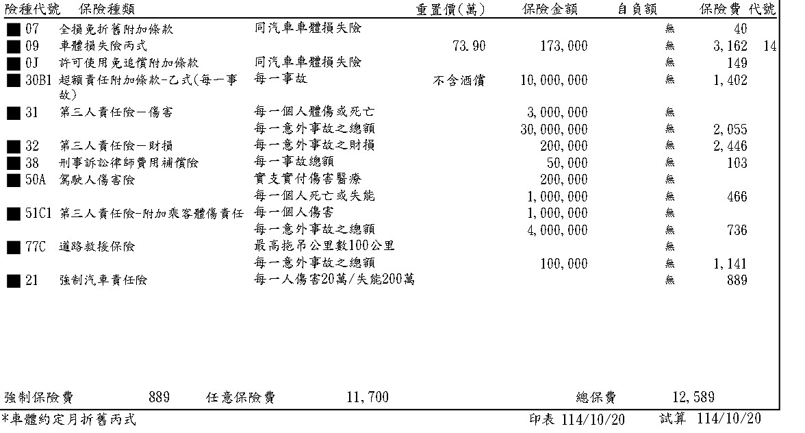 31 都有超額,可以降低為 200萬/1000萬,如果怕不夠,不如超額+到2000萬額度 50A 如果有自己保壽險附加意外險,或是公司團體意外險,不如把這錢哪到這邊增加額度 51C1 駕駛有犯錯的狀況,才會賠,有些保險公司還要乘客主動告官求償才賠(對!就是你的乘客告你) 77C那是什麼鬼東西,把車開到山谷救上來,還是開超跑,需要拔牌,放進鷗翼車,全保密狀態拖回修理廠