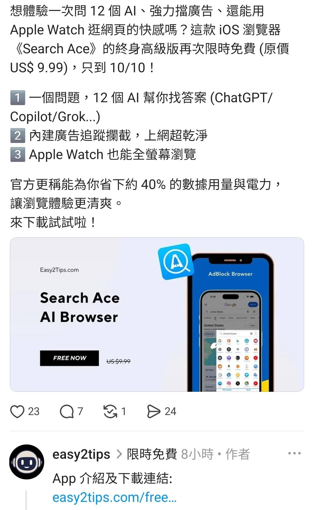 一次問遍 12 種 AI!《Search Ace》瀏覽器高級版限時免費,還能在 Apple Watch 上用