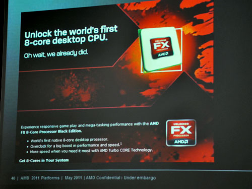 2:4核採用紙盒,8核用鐵盒包裝 3:各個核心可以獨立頻率運作 4:E3現場正在運作的8核推土機在1.4V電壓下僅有19度 ![]()