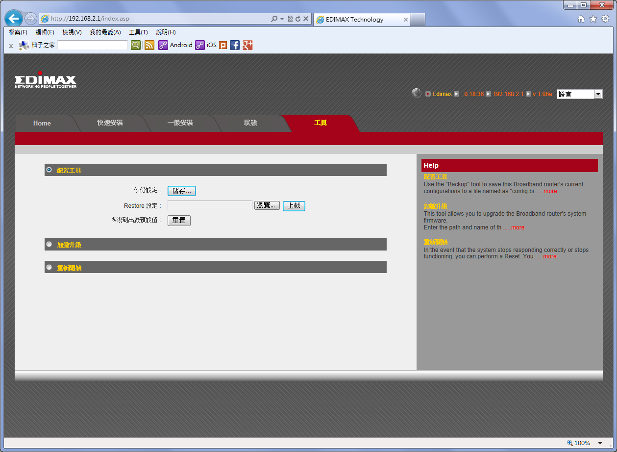 所以一台無線分享器很重要,可以支援3G就太棒了,隨時隨地手上的所有3C產品都能連上網路。 EDiMAX 3G-6218n,只要有網路就能上,而且還支援iPhone。 內建鋰電池 支援xDSL、3G(UMTS/HSDPA/HSPA/HSUPA/EVDO/CDMA)、Cable、WISP上網 支援3G網卡,也支援iPhone的3G分享。 包裝內容有分享器一台、鋰電池、網路線、安裝指南、光碟片、電源變壓器。 包裝背面列出了幾個主要功能 支援各家電信公司,除了台灣的電信商還有中國及香港的電信服務商。 對於兩岸跑的台商也非常適合。 支援多種上網方式,還有備援,這是當一方網路斷線的時候,能夠確保網路是保持連線的狀態。 開箱了!裡面有產品保固卡、分享器一台、鋰電池、網路線、安裝指南、光碟片、電源變壓器,還有包裝上沒提到的USB延長線一條。 來看看分享器本體,正面有五個指示燈號。 從上到下是電源、充電、無線網路、Ethernet和網際網路。 左邊有LAN/WAN切換開關、WPS按鈕及電源開關。 另外一邊是充電孔和RJ-45網路埠。 在分享器的頂端是USB孔,提供3G網卡及連接iPhone,分享3G的網路來使用。 電池容量為1880mAh,官方數據為待機8小時,連接一般網卡連續使用3小時,如果連接iPhone則可以連續使用1.5小時。 電池背面是注意事項,產地在台灣。 --------------- 設定步驟 --------------- 預設帳號密碼為admin/1234 將分享器開關切換到「LAN」,使用網路線連接電腦,開啟瀏覽器在網址輸入「192.168.2.1」之後會跳出認證視窗,請輸入admin/1234。 ![]() 右上角有多國的語言切換,選擇繁體中文,操作起來會比較容易點。 ![]() 然後點「快速安裝」,設定時區選擇「(GMT+08:00)Taipei」,選擇完成後按「下一個」。 ![]() 選擇Internet連線模式,依照業者連線模式做選擇。 ![]() 設定完成並按下確定後,會出現儲存成功,請按APPLY重新啟動套用變更的設定。 ![]() 網頁會開始倒數100秒鐘,時間到了之後按下OK回到設定畫面。 ![]() 接者點一般安裝底下的無線,選擇波段、無線網路顯示名稱(SSID)。 ![]() 設定無線網路的頻道。設定完畢後按下套用儲存變更。 ![]() 按下左邊的繼續,可以繼續其他的設定;右邊的接受儲存設定變更並重新啟動分享器。 ![]() 剛剛只設定了無線網路,但是還沒有加密,這會讓無線網路被盜連,所以在安全設定的部分選擇加密方式,不過要注意手上設備是否支援較新的加密方式。 ![]() 一般安裝底下的進階設定可以設定Qos,控管網路頻寬。 ![]() 因為支援3G網卡及iPhone的3G分享,最底下也可以設定流量限制,避免3G爆量。計算方式以月分為單位。 ![]() 狀態底下的系統部分可以看到機型(翻譯成模型好像怪怪的)、時間、韌體版本等資訊。 ![]() 而狀態底下的設備狀態會顯示無線網路的設定和網路設定。 ![]() 工具的地方可以將目前的設定備份及還原或是重設到出廠值。以上是無線網路設定。 --------------- 3G網卡分享 --------------- ![]() ![]() 如果要設定3G網卡則到一般安裝底下的「廣域網路設定」,選擇國家、3G電信服務商,APN一般設定為Internet。(如果電信商選擇中華預設會是emome) ![]() 撥號輸入「*99#」,輸入完成後別忘記按下套用來儲存變更。 同步發表於部落格