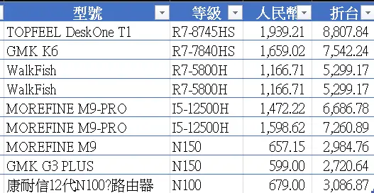 能掏當然比較便宜,但 RAM/SSD 成本已占一半有。 若輕度使用,配合低發熱的 SSD。 GMK 算是知名,且價錢偏低的選擇。 準系統沒 SSD 當然也沒預裝系統。 至於怎麼啟用系統有些問客服,或有些提供系統安裝下載 (類似把安裝好的系統轉成ISO)。 這 YT 之前應該是賣不少這類產品。 https://www.youtube.com/watch?v=EqBi3wIUhJQ 我買過的準系統 型號 等級 人民幣 折台 TOPFEEL DeskOne T1 R7-8745HS 1,939.21 8,807.84 GMK K6 R7-7840HS 1,659.02 7,542.24 WalkFish R7-5800H 1,166.71 5,299.17 WalkFish R7-5800H 1,166.71 5,299.17 MOREFINE M9-PRO I5-12500H 1,472.22 6,686.78 MOREFINE M9-PRO I5-12500H 1,598.62 7,260.89 MOREFINE M9 N150 657.15 2,984.76 GMK G3 PLUS N150 599.00 2,720.64 康耐信12代N100路由器 N100 679.00 3,086.87 表格很難對齊,可以看下圖: https://i.meee.com.tw/8GaKkbV.png 若對上面型號好奇,我大概能回想一些,回答一些。(老了記憶真的變差了) 不過過年家裡都收拾,要拆的話不方便。 多到客廳、房間一堆零件,被唸,稍微收起來一下。 PS: 價錢貼錯,修改。 此文章於 2026-02-14 11:51 PM 被 ghostcode 編輯. |