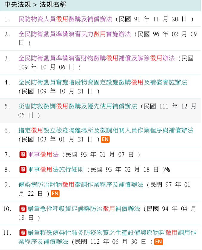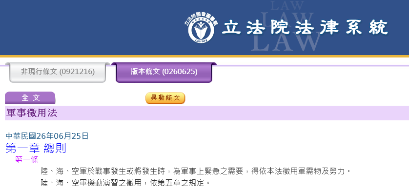 ??? 你不知道國民黨在民國 26 年就訂了軍事徵用法嗎? ![]() ![]() 後來民國 91 年改用全民防衛動員準備等相關法條替代。 https://law.moj.gov.tw/Law/LawSearc...%94%a8&sSearch= ![]() |