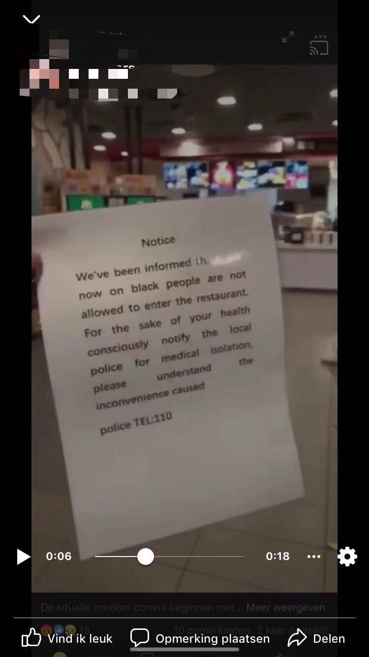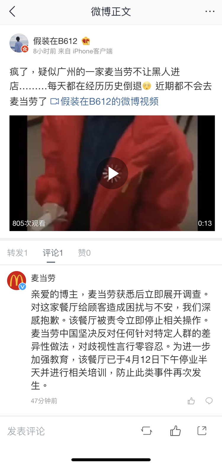 昨天在廣州的一家麥當勞店內一張疑似歧視黑人的公告被一位在網友拍攝並發上網路