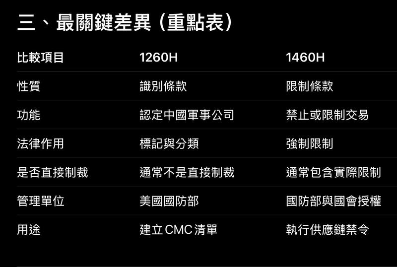 上述公司在該名單發布約1小時後被五角大廈撤回,並未正式生效,原因不明,長江存儲和長鑫是直接移除沒錯 五角大廈突撤新版中國軍企名單 未說明原因 但豬油屎報在後來報導自行下標和內文寫三寶將訪中 川普將訪中 五角大廈突撤新版中企黑名單 順便打臉提醒小跟班智障閃兵廢物: 鐵人所指的那些公司是在1260H清單,不是1460H,兩者有何不同? 用你所謂AI垃圾幫你科普一下,下次要提醒別人記得要用正確資訊,除非你全身又癢 ⸻ 一、1260H條款清單(Section 1260H List) 正式名稱: Section 1260H of the National Defense Authorization Act for FY2021 由美國國防部建立並維護 核心目的 定義並公布「中國軍事公司」(Chinese Military Companies, CMC) 這些公司被認定為: • 由中國人民解放軍控制 或 • 為解放軍提供支援、技術或服務 或 • 屬於中國軍民融合體系 該條款提供新的法律定義與分類標準。 ⸻ 1260H清單的法律效果 列入1260H清單後,會產生以下影響: 1. 國防與政府採購限制 • 美國國防部不得與其簽約 • 國防承包商需避免使用其產品或服務 2. 投資與金融後果(間接) • 常被美國財政部用於制定投資禁令 • 可能導致美國投資人撤資 3. 聲譽與合規風險 • 被視為軍事相關企業 • 增加監管與制裁風險 ⸻ 1260H清單性質: 👉 「識別與標記清單」(Identification list) 它本身主要是: • 法律認定 • 安全風險標記 • 為其他制裁或限制提供基礎 但本身不是直接制裁條款 ⸻ 二、1460H條款清單(Section 1460H List) 1460H條款較少公開討論,但其功能不同。 核心目的 1460H是: 👉 建立「直接限制或禁止與列名公司交易的條款」 與1260H相比: • 1260H:定義與識別 • 1460H:施加具體限制 ⸻ 1460H的實際作用 1460H通常涉及: 1. 更嚴格的國防採購禁止 例如: • 禁止採購產品 • 禁止使用零件 • 禁止合作 ⸻ 2. 國防供應鏈排除 禁止這些公司: • 進入軍事供應鏈 • 參與敏感技術合作 ⸻ 3. 強制執行措施 與1260H相比: 1460H更偏向「強制限制條款」 ![]() ⸻ 四、簡單比喻(最容易理解) 可以這樣理解: • 1260H = 黑名單「標記」 • 1460H = 黑名單「處罰與禁用」 或: • 1260H → 認定「誰是軍方相關公司」 • 1460H → 決定「對這些公司做什麼限制」 ⸻ 五、實際運作流程(重要) 典型流程: 1. 國防部依1260H → 認定公司為軍事公司 2. 之後國會或行政命令 → 依1460H或其他條款 實施: • 採購禁止 • 投資限制 • 技術限制 ⸻ 六、歷史背景(重要) 1260H是用來取代舊的: • Section 1237(1999 NDAA) 並提供更現代、更廣泛定義。 ⸻ 七、總結(一句話版本) 1260H = 認定誰是中國軍事公司 1460H = 對這些公司實施具體限制 1260H 與實體清單並非完全重疊,實體清單範圍更廣,適用出口管制,而1260H主要針對國防採購。 還有個財政部CMC 清單著重金融制裁、投資禁令,三者可能重疊也可能一家只在一兩個清單上 總之那些清單和三寶一樣,都是拿來豪洨用的 ![]() |