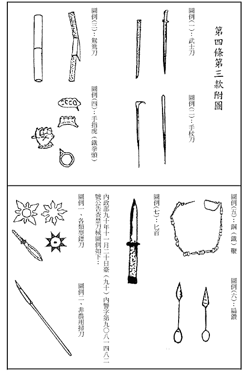 老實說台灣也有槍砲彈藥刀械管制條例 很多種刀光持有都是違法的 刀械:指武士刀、手杖刀、鴛鴦刀、手指虎、鋼 (鐵) 鞭、扁鑽、匕首 (各如附圖例式) 及其他經中央主管機關公告查禁,非供正當使用具有殺傷力之刀械。 ![]() 你看看連手指虎都不得持有... |