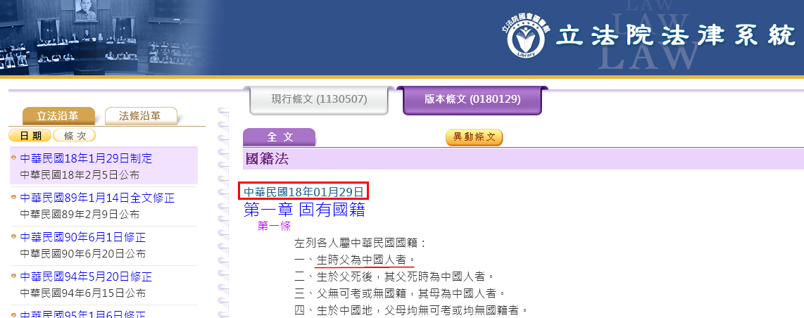 現年 50 歲,算是起來是民國 64 年生。 按照當事人出生那年的「中華民國」國籍法, 「生時父為中國人者」, 當事人應屬中華民國國籍。 在座的各位網友, 算年齡大部份也是應該依父母是中國人, 才有中華民國國籍的。 |