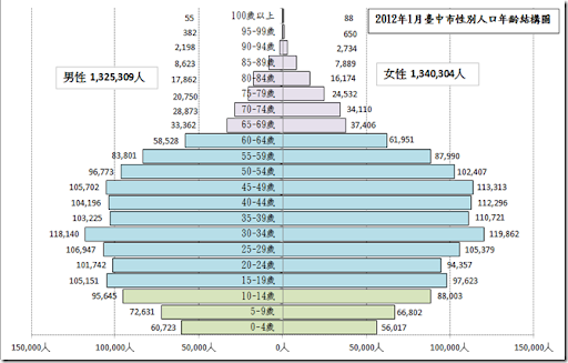 台中市人口結構圖 圖片出自http://taisoci.blogspot.tw/2012/02/...t_22.html#links 資料為2012年一月 現在2014 多少有誤 但是個人認為差異不會太多 尤其少子化 年輕人越來越少 ![]() 他小孩的胡婷婷35歲 我先假設他指的小孩 年輕人 是35歲以下 但是20歲以上才具有投票權 那其實20-35的人口還比35歲以上的人口少很多 真正讓他落選的 並不是只有年輕人 連為什麼失敗都不知道 還講的出這種鬼話 掰的出這種鬼邏輯 真的是........... ![]() 此文章於 2014-12-02 07:54 PM 被 藍色&憂鬱 編輯. |