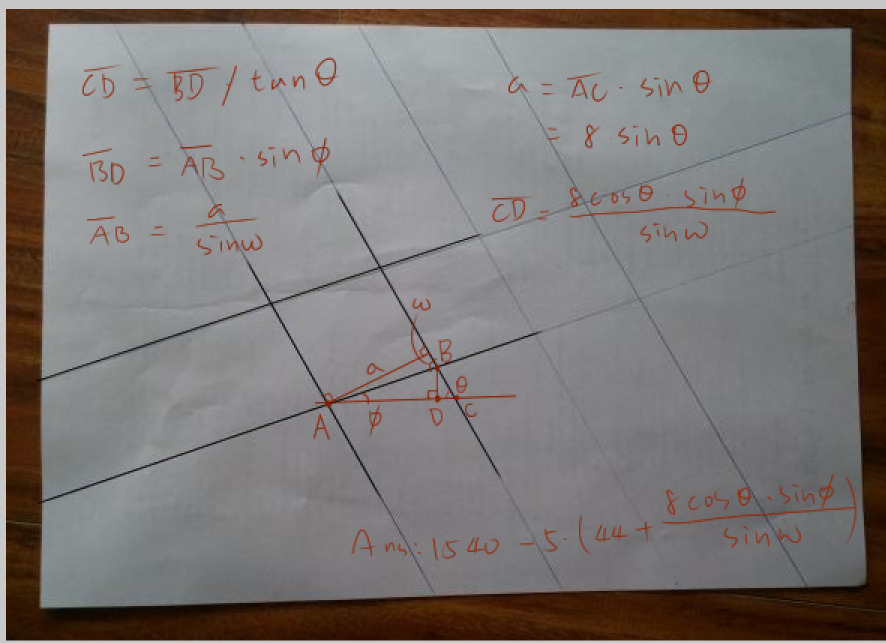 這題需要三個夾角的未知數才能解。 前圖多出的部份,就是下圖的線段CD, 求出線段CD再代回原式即可。 不知有沒有更簡潔的解法...... ![]() 答:1540 - 5 * (44 + 8*cosϴ*sinФ / sinω) 此文章於 2015-03-28 06:53 PM 被 Adsmt 編輯. |