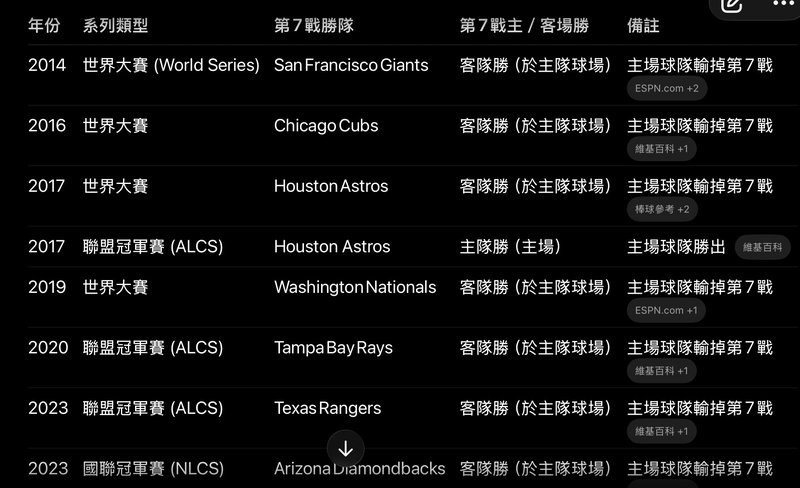 明天兩隊要打Game 7,根據轉播單位的圖卡。自從 MLB 採七戰四勝制以來