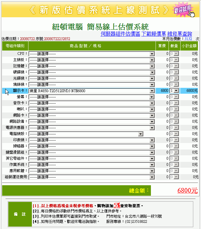 昨天晚上一下班衝去光華鈕x ~ MSI R4850-T2D512SP/D3 NT$6990 店員說我看錯了 網站報價是報心情愉快的... ![]() 囧or 囧or 囧or 每日價格的浮動依門市價格為主、以上僅供參考 囧or 囧or 囧or 今天晚上打算去隨便找一家有賣組合包的買一買 懶得再逛來逛去了 |