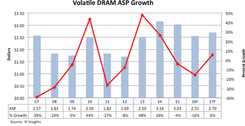 SAN JOSE, Calif. – Oversupply of DRAM will drive average selling prices (ASPs) of the memory chips down 16% this year, dragging down the overall IC market to a contraction of 2% in 2016, according to the latest report from market watcher IC Insights. Declining shipments of PC, notebooks and tablets as well as a slowdown in smartphone growth will contribute to an overall decline of 19% in the DRAM market this year, the company said. DRAM prices are known for big swings with ASPs hitting a recent high of $3.16 in 2014 up from a recent low of $1.69 in 2012. ![]() A plot of DRAM ASPs since 2007 (below) looks “like the profile of an alpine mountain range,” IC Insights said. Demand from servers and new smartphone models started kicking DRAM prices back up this summer toward a forecasted rise to $2.70 in 2017. The upturn may be short lived, IC Insights said. Two China-based companies --Sino King Technology in Hefei, and Fujian Jin Hua IC Company -- plan to start producing DRAM in late 2017 or early 2018. “It remains to be seen what devices and what technology the two new entrants will offer but their presence in the market could signal that another round of price declines is around the corner,” the report said. ![]() 一家烤肉兩家香 爐主還是爐主XD |