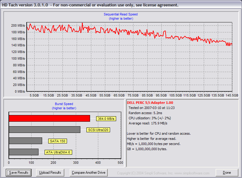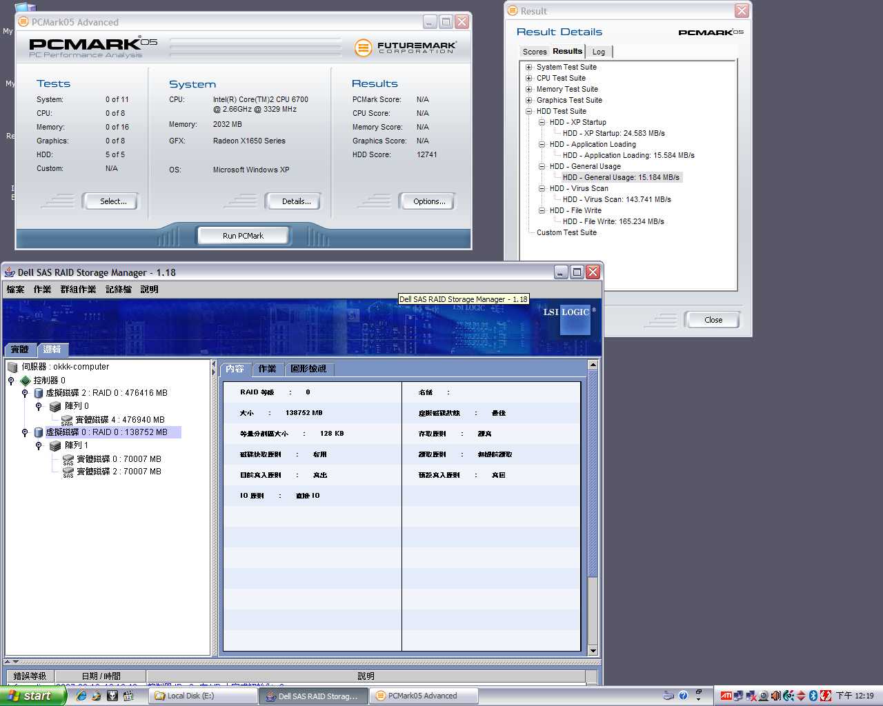 說的是,測到的不是硬碟的速度。 關掉Write Back,Read ahead.就會看到正常的數據 (其實是我的卡沒BBU打不開@@) 一樣的SAS卡,硬碟是Maxtor 15KII 73g*2 16k ![]() 下面一樣放毒 :p PCMark05 Maxtor 15KII 73g*2 128k ![]() HD Tach Maxtor 15KII 73g*2 16k ![]() |