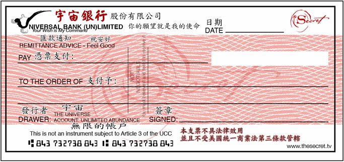 會有這個念頭想修改這張支票 起因是 看了 秘密 這本書 裡頭第 108 頁有提到 空白支票(http://www.thesecret.tv) 書本裡 寫了這段字句 這張支票是你的,來自宇宙銀行,填上你的名字、金額及其他細節 然後把它放在顯眼的地方,讓你每天都看的到。 看到那張支票時,就去感受當下擁有那筆錢的感覺; 想像你去花用那筆錢、去買想要的東西、去做想做的事。 去感覺那是多棒的事呀!要知道它就是你的。因為當你要求時,它就是你的了。 :hungry: 所以才會想問 能否 將 紅色框框裡的字 改掉 :ase 引用: