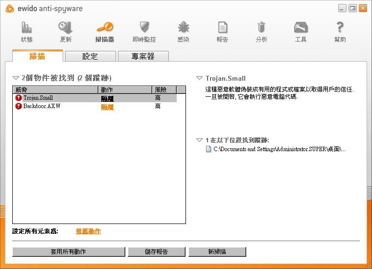 ![]() 請安裝ewido anti-spyware 這軟體是公認頂級防毒木馬抓掃毒率很高的 世界第一名認可網站:http://www.anti-trojan-software-reviews.com/ 下載:進入下載網址!!! |
