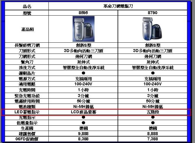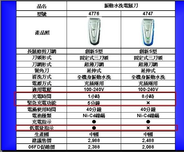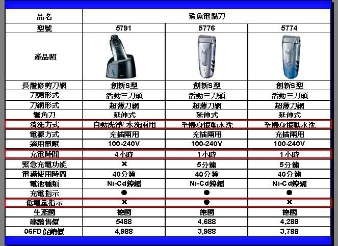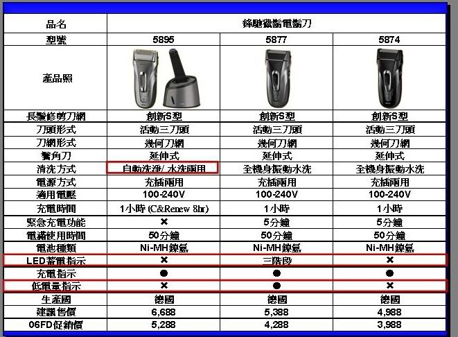 5874 活動式三刀頭 幾何刀網 S型刀網 全機身震動水洗 充電指示 刀頭刀網更換指示 延伸式鬢角刀 充插兩用 國際電壓 充電1時可用50分 5分緊急充電 5877 活動式三刀頭 幾何刀網 S型刀網 全機身震動水洗 三階段蓄電顯示 刀頭刀網更換指示 延伸式鬢角刀 充插兩用 國際電壓 充電1時可用50分 5分緊急充電 5895 活動式三刀頭 幾何刀網 S型刀網 附清潔座,自動水洗、水洗兩用 充電指示、清潔指示 刀頭刀網更換指示 延伸式鬢角刀 充插兩用 國際電壓 充電1時可用50分 基本上我是賣P牌的啦 :laugh: 不過聽說這三款貨源已經被大型百貨公司壟斷,所以一般3C量販通路不一定有貨 購買前請多打聽 ;) 而且B牌自從被美國寶僑併購後,今年在父親節檔期這段時間也出現了蠻多問題,讓部分在第一線的工讀生出現了不滿和不耐,也著實受了不少委屈... :think: 不過好在的是,過了8/8就結束了,雖然因為碰上中元節以及經濟不景氣,銷售量銳減 :cry: |