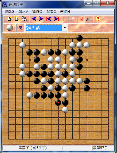 一般來講,電腦比較難應付過多的可能性,所以我的方法, 就是盡量把棋下的擠在一起,造成很多能變成活三的機會, 就能輕易痛宰豬八戒囉,所以我是靠電腦的缺陷才贏的, 而不是靠棋力 :laugh: 。 |