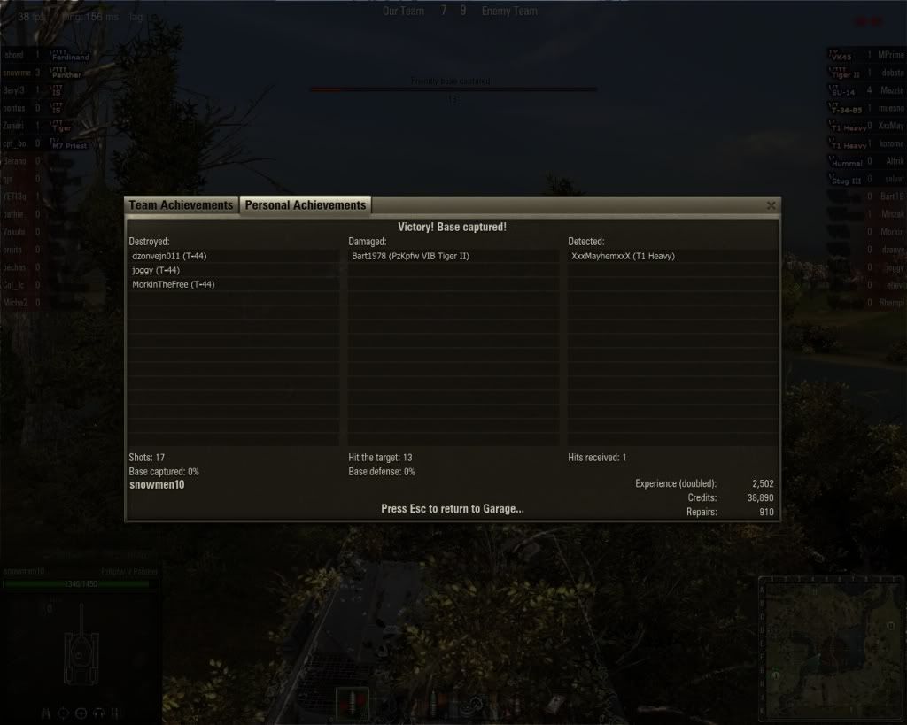 哼∼哪位傢伙說 T-44 三連星稱霸回來的? :laugh: ![]() 剛開戰,我和 IS 從北邊基地衝到選定的位置附近後,看到一輛 T-34-85 衝到中間來,我想不對,該不會 T-44 從中間來吧,趕緊開狙擊視窗看可是沒看到時,看到旁邊 IS 點 Minimap,原來三台 T-44 一起從東邊我們這邊攻上來,而且距離不到 300 公尺了!趕緊把金錢豹的砲塔轉 90 度過來,金錢豹砲塔轉的非常慢,轉到時他們已經不到 200 公尺了!第一輛 T-44 已經朝我開火,彈砲!我趕緊斷第二台履戴因為第二台在瞄我而第一台發射過了。履戴果然應聲而斷,可能也太靠近了所以 T-44 馬上掉 15%。那輛 T-44 嚇了一跳開砲結果當然因為突然打橫 Miss,看第三台來勢洶洶我趕緊後退往屋裡撤(就是把房子不小心破壞了 :laugh: ),果然對方 Arty 一發往我剛剛的地方打下去,嘿嘿沒損血。旁邊 IS 也在瞄第一輛 T-44,而我繼續用力打第二輛 T-44。T-44 在 88L71 的砲火下真的是沒什麼地方打不穿,第二發就讓第二台 T-44 掉 25% 的血。第二台繼續往我這邊打過來可是沒打中(拍謝∼虎一應該就會讓你打中了)。第二台 T-44 履戴修好衝過來我旁邊,他大概以為我會退後,可是我衝上他側邊往他後面打。不知道為什麼又把它履戴打斷,開始想繞他可是他砲塔真的轉的很快 :tu: 就決定停下面對他。想想不對反正附近很多房子退到房子後面結果第三發他又 Miss :laugh: 出來第四發解決他。 這時去看第一台和第三台 T-44,其實我也分辨不出哪台是第一哪台是第三,不過他們正在 Gang Bang 那台 IS 而我們的 4502 看到這邊情況不對回應我們的請求衝過來,可是他還在至少 400 公尺外散步... 那輛 IS 快爆了!趕緊打第二輛 T-44。這輛開始繞我。這個地圖其實真的沒什麼地方讓他繞,而且他發射好慢,看起來也是 100 不是 122 呀奇怪... 這時我們 Arty 醒過來終於對他打了一發... E04 的!沒中暴風打到我!我順利再解決一輛 T-44 後打了第三輛 T-44 一發,那輛 T-44 剩下 50% 的血拋下我們想去找我們 arty,結果被 4502 轟一發剩下 15%,我那時就在想:讓我打∼讓我打∼讓我打∼ 果然 88L71 的裝填不是蓋的,被我一發轟掉... 我對這三台 T-44 總共發了 11 發砲左右。 打完後我就在公頻上打:Arrrr... Who's ur daddy! :laugh: 後來其實就在想... 沒 4502 那台 T-44 照樣被我斷腿打... 只是可能會被別人撿走而已 :stupefy: :agree: :agree: :agree: 嘿嘿∼睡午覺起床第一件事情就這麼爽! 而且整個過程中我的損血是被友方造成的 :cry: |