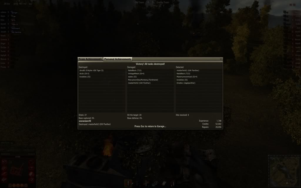Victory! Battle: Malinovka Friday, January 07, 2011 9:25:52 PM Vehicle: Panther II Received Experience: 1,746, credits: 52,002 幫妳報仇了(88L71,怪物場) 而且遇到德軍的車,要是後面有隊友我就會殺到個位數放過。 蘇聯的車絕對要搶把它滅了。 |