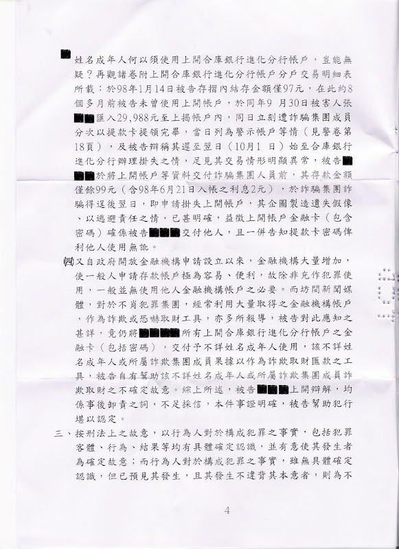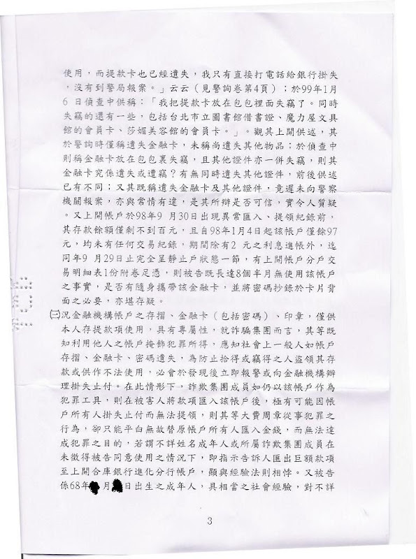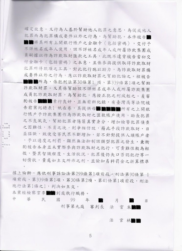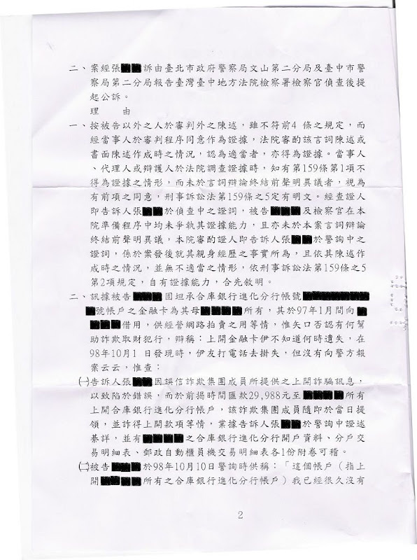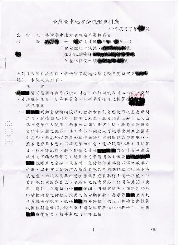 我來說明一下好了!我不是被告,被告是我女友的姐姐。 案情主角: 1.我女友的姐姐在此稱:被告 2.詐騙集團在此稱:犯人 3.被騙錢的張某某在此稱:被害人 案由: 由於被告因之前財務問題導致信用破產,所以不便自己持有帳號, 所以跟母親借帳號使用(也就是被犯人利用的帳號)。 此帳號之前僅用於網拍使用,不過網拍情況不佳,所以停擺了一陣子, 直到案發前一陣才又想要拿出來網拍使用,卻發現不見了! (由於長期未用怕密碼忘記,將密碼寫在紙上,連同其它不重要卡片放在名片夾中,一同遺失了) 10/1發現遺失,就立即向銀行電話掛失,以為掛失就可以了!並不知情還要報案 (老實講我本人也不知道卡掉了還要報案!) 一切荒妙的事情就開始了! 從被告的母親親自到銀行要重新辦卡,卻被銀行報警帶走! 錄口供時,才知道被害人網路購物,被犯人騙走了錢而報案,導致帳號列為警示帳戶。 被告住台北還跑到台中來,一路舟車勞苦並且向公司請假,從偵察庭一直到開庭, 本以為沒做過的事,法官沒有任何證據會判無罪,但沒想到長達快半年的盡力配合檢調單位, 竟是換來一張有罪的判決書! 我終於知道為什麼會有那麼多的冤獄產生了! 原來只要法官認為事情是這個樣子,那他就可以這樣判了,不需要任何證據! 卡片事實上就是遺失了,法官也沒有人證、物證、事證證明是被告親手交給犯人,卻可以判定為“交付“!法官真的是殺人不眨眼~~~~。 判決書如下: ![]() ![]() ![]() ![]() ![]() ![]() |