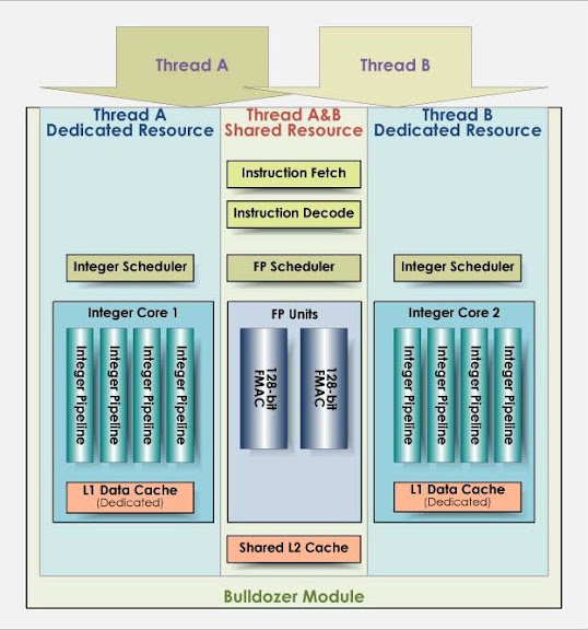 看圖片比較快 ![]() 一個完整推土機最小完整單位是模組 如果稱一個最小完整單位為1 core,那推土機就是1M=1C2T 不過推土機比較接近於實體2core勝過於intel 的HT 所以一般人還是會直接說推土機是1M≒2C2T 這個推土機的1M跟K10的2C2T比起來效能低了一些 面積也小了一點 效能低的部位會出現在整數運算單元(K10有三個,推土機1M有四個->1核心兩個) AMD認為 CPU有三個整數單元有點矯枉過正 三個整數單元比起兩個來說 電晶體增加很多,效能只增加一些 現在AMD,intel的作法不同處在 AMD將核心單純化,可提昇使用效率、降低耗電(時脈可能因此受惠可以拉高一些) 單純化的結果是單執行緒會慢一些,把Performance/Watt 提高 多執行緒程式是它的優勢 intel則是核心複雜化,單執行緒、多執行緒都想要吃下來 耗電量增大 時脈可能拉不高 (在製程能力優於AMD的前提下,這些缺點可能不是問題) |