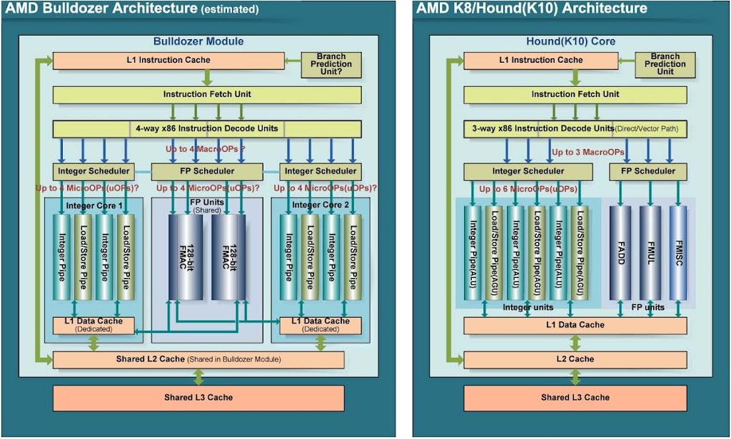 這邊錯了,一個完整區塊就是一個模組(module) 不需要特別命名 一個模組有兩個整數核心,這兩個整數核心內各有兩個整數運算單元 1M≒2C2T,1C≒ 2 Integer Pipe + share L2 +share FPU 還是來個推土機跟K10的比對圖 比較快 草綠+藍綠為一個整數運算(Integer Pipe) ![]() 引用: