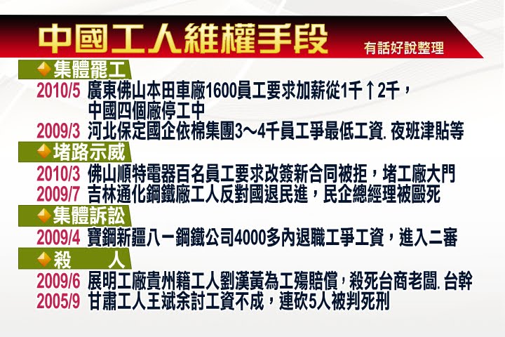 大陸勞工領不到錢,工作條件不佳..會上中南海上訪嗎??? 處理非常事情只能用非常手段..台灣勞工做不到,大陸勞工可是樂此不疲... 在現在的政治環境下,政府跟政治人物在替勞工爭取權益的事情上敢做的不多... 如果勞工沒有打進總統府,我想那些雞蛋還是拿回家做早餐..別浪費了... |