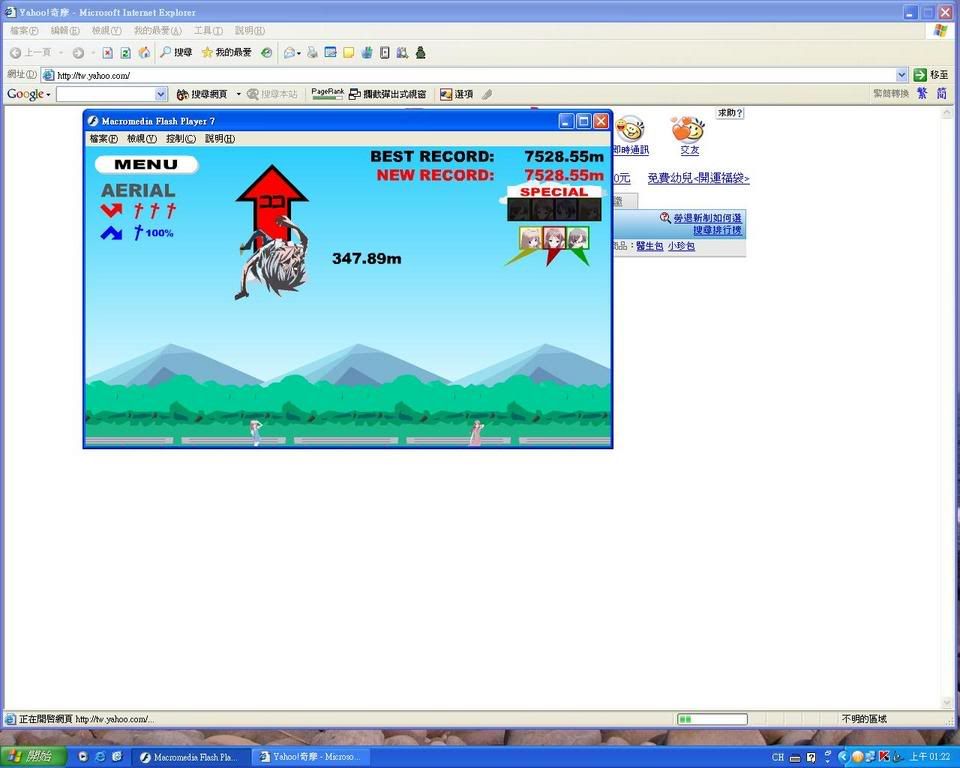 我最高彈到964.xx m, 距離17019.xx m, 最高那次好像是type D連彈幾次已經在飆速了, 然撞到angle up, 於是高度就很高了, 當然,有這種高度就等著破萬吧, 於是就打到一萬七千多了........ type D的金色狀態要好好利用, 因為每次落地等於打擊一次, 會越飛越高又越飛越快, 印象中高度破三百的時候大概就是三十幾秒不落地了, 曾經一個金色狀態不小心就飛了8000m, 不要遇到眼鏡妹就是了, 打這遊戲最難熬的是飆速之前, 因為很慢又很無聊。 |