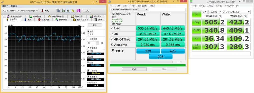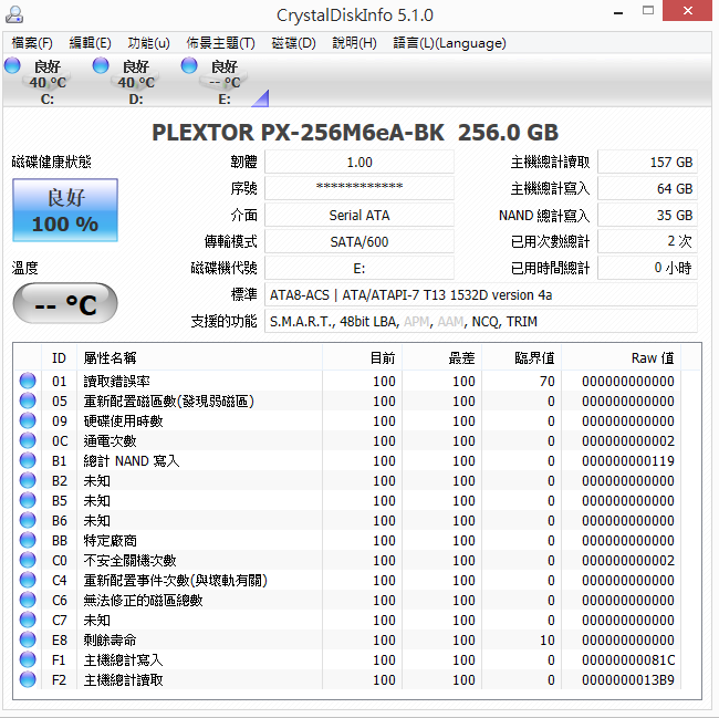 ![]() ![]() ![]() ![]() 捷元貨 ![]() 2016年4月製造 ![]() ![]() 內容物 ![]() ![]() ![]() M6eA-BK本體 = PX-M6e(A) 256GB M.2 + 轉卡 + 散熱片 ![]() ![]() ![]() ![]() ![]() 電源指示燈 ![]() 讀寫指示燈 ![]() 測試平台 MB:GIGABYTE GA-B150M-DS3H DDR3 CPU:Intel Core i7-6700T RAM:Kingston 8GB DDR3 1600(KVR16N11/8) ×2 OS:Windows 8.1 64Bit SSD專屬開機畫面 耗費2秒鐘 不能跳過 ![]() 啟動裝置選擇 ![]() SSD資訊 ![]() 測速 ![]() 測速後資訊 ![]() 和SATA SSD不同 WIN 8.1直接複製系統碟不能正常開機 得用重灌或修復大法解決 同平台EZLINK Panzer IV-S 120GB SSD測試 同批號SLC顆粒×8 版本 ![]()
