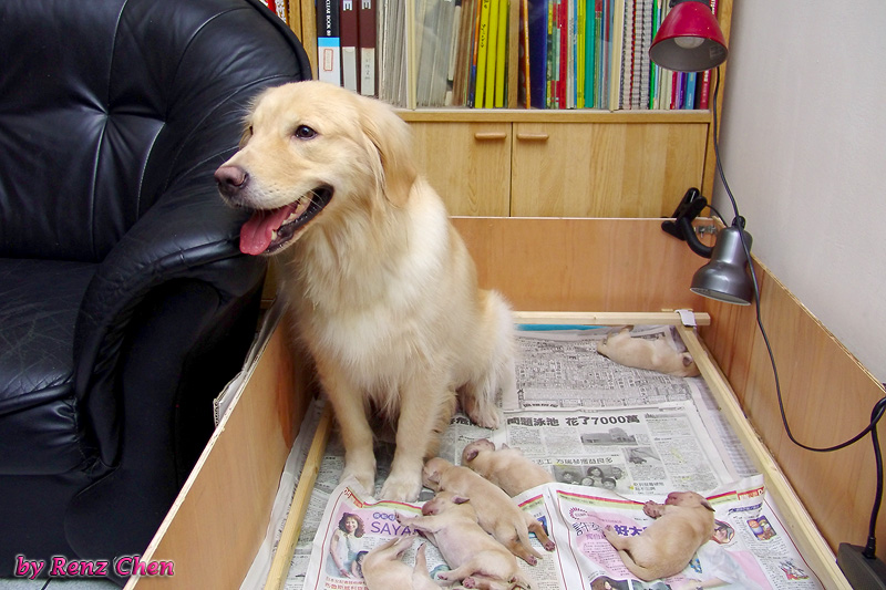 不知道有沒有人還記得鳥仁半年前貼過的黃金獵犬波波照片,他現在當媽媽了喔,7/24 晚上十點半生了小寶寶,總共八胎,但是其中老大出生時因為兩個媽媽都經驗不足不幸去世了,所以剩下七隻,全部都很健康,波波也一直在學習如何當個媽媽。