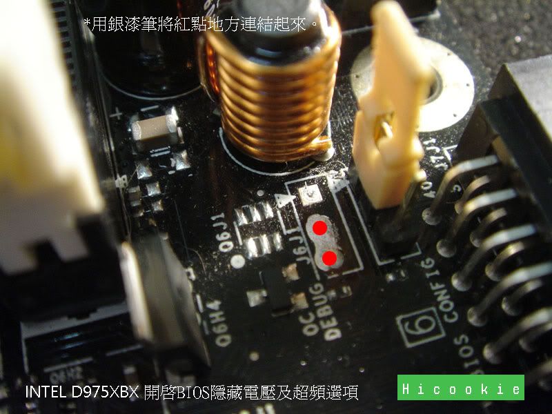 如下圖,將二點連接後,可以開啟BIOS內原本INTEL的隱藏超頻及電壓選項!