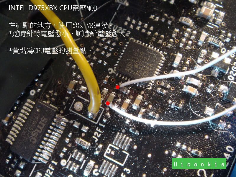 CPU電壓,BIOS原本最高為1.6v(實際為1.54v),透過下圖的MOD,可增加CPU的電壓。