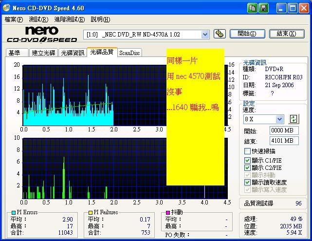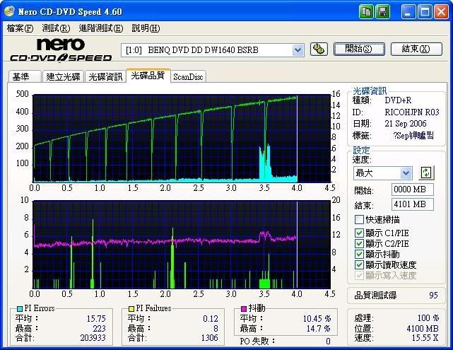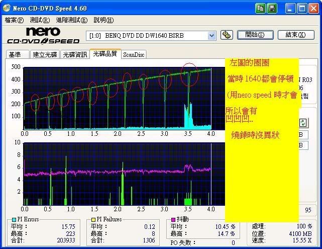 我發現標題應該換成 "我的1640無法用nero speed 測試 " 用之前 1620燒的片子測試全都變型了 ![]() 1640都會停頓 (用nero speed 時) 所以會有凹凹凹 (耶 .今天是921..) ![]() 借別人的4570測試不會 ![]() 此文章於 2006-09-21 09:10 AM 被 0800 編輯. |