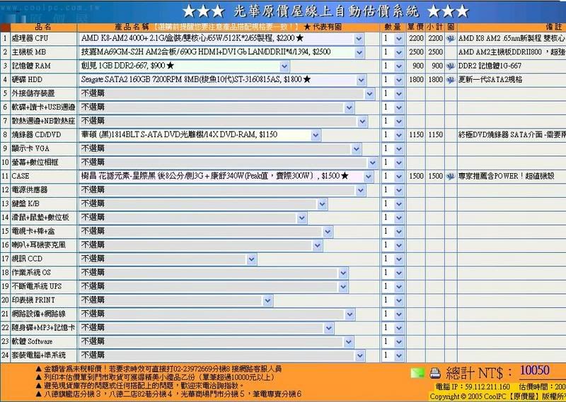 ![]() 小小建議把pioneer 112A換成華碩1814BLT SATA介面 電源換成康舒I-POWER 350W,便宜耐用又終保 ![]() 如果你朋友只是下載bt和一些線上影片而不是玩一些3D遊戲的話 可以考慮改買合板捨棄掉顯示卡,把預算拿去買更大容量的硬碟會比較實在 ![]() 至於你說要10000元組文書機的話,直接看圖吧 ![]() ![]() 多50元就跟店家殺價一下就好了 ![]()