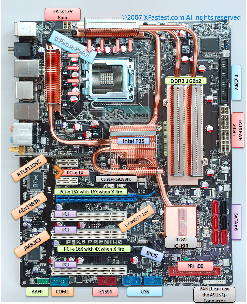 1.大大觀察很仔細..最上面風扇..沒有溝潮 但有付了2組PWMIC風扇就可他裝上去 2.PWMIC設計 因為設計 用料不同 所以 背面MOSFET又出現 3.EPS12V電感也改成封閉式 因為延用P5K-D設計 4. NB.RAM散熱片固定終於改成較有力的彈簧+螺絲了 是很好 但我個人不認為.."MOSFET還是很雞肋的Plug-in" 因為從力學角度來看已經相當夠用...彈簧+螺絲 爽度問題 沒用強化背板,板子會彎 --> 這我更不認同 因為這樣每一家版子都要灣了... 5.T-Tree 這是概念設計問題...但Memory Contorl 是北橋...難道Intel P35 北橋有不同設計嗎...我想這些資訊我在去請教一下專家再來回答... |